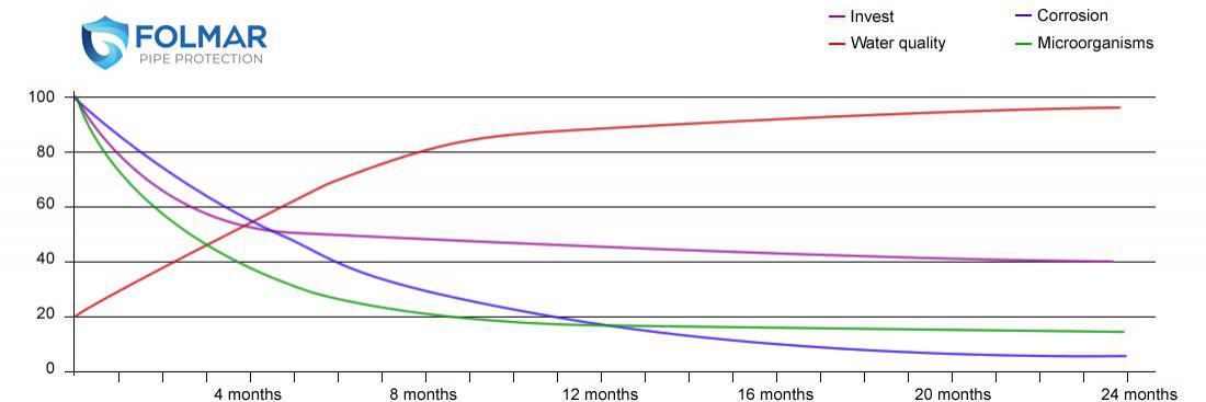 FOLMAR reacts chemically with the surface of a pipe forming a thin, mono molecular film. This barrier-film prevents corrosion reactions by preventing direct contact between the pipe surface and the water. In the case of existing corrosion, FOLMAR reacts with the corroded surfaces and stops additional degradation. As the hydro-metallic oxide layer is covered, new deposit protection is also established. Over time, FOLMAR will be absorbed onto surfaces forming a barrier film throughout the entire system – from injection point to tap. This corrosion inhibition technology considerably decreases the corrosion rate of a material exposed to a water flow, enhancing infrastructure lifespan and protection the treated water from re-contamination. FOLMAR is an effective solution for a safe water supply.